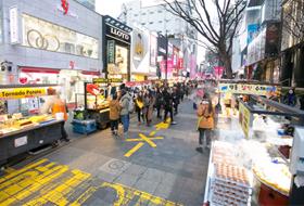走在繁华的明洞街头,随处可见各种人潮聚集的小吃摊。久而久之,明洞主干道上便形成了一条“L字形”小吃街:由从地铁4号线明洞