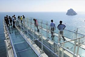 2月26日釜山南区五六岛日出公园附近人声鼎沸。37m高的悬崖边上朝大海延伸出去的透明栈道向人们展现了令人眩晕的风景。