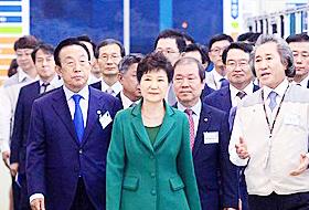 韩国总统朴槿惠19日视察了庆尚北道龟尾市国家工业园内的庆北产学融合地区和智能工厂,还出席了TORAY尖端材料公司龟尾第4
