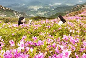 杜鹃花在韩半岛能够一直开到初夏的6月初。不必因为平地的杜鹃花凋谢而感到失落。 <b>◇陕川郡黄梅山&l