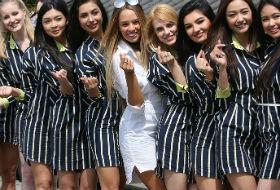 28日上午,首尔中区的韩屋村出现了一群美女。她们个个面容精致,身材高挑,拥有前凸后翘的迷人曲线。她们身着统一的条纹套装,