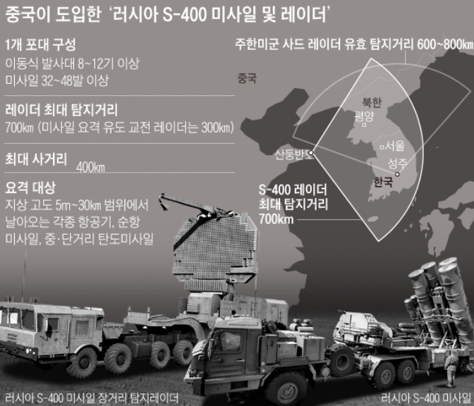 中国声称有效探测距离为600-800公里的驻韩美军萨德雷达能够彻底监视中国内部动向,一直进行强烈反对。实际上,萨德雷达固定向着朝鲜一侧,几乎监视不到中国内陆的动向。相反,S-400导弹雷达如果被部署在山东半岛,就能够监视韩美两国军队飞机等动向。