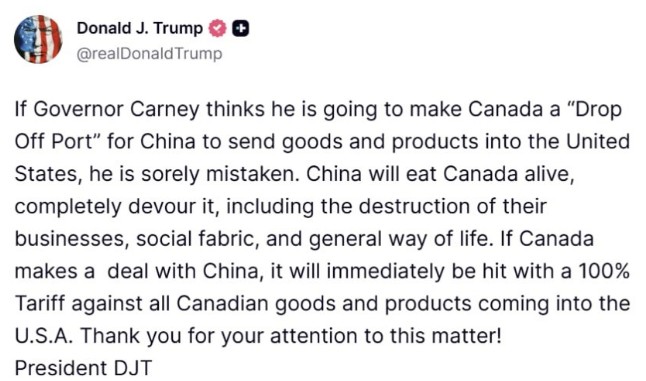 当地时间24日,特朗普在社交媒体真实社交上发帖称:“如果卡尼州长(Governor)认为他可以把加拿大变成中国的‘卸货港(Drop Off Port)’,那他就大错特错了。中国会生吞加拿大,包括企业、社会结构、生活方式在内,一同全部吞噬掉。”这里使用了“州长”一词,是特朗普在表示要将加拿大变成美国的“第51个州”时使用的带有嘲讽意味的表述。特朗普接着说:“如果加拿大与中国达成交易,那么所有进入美国的加拿大商品和产品都将立即被征收100%的关税。”