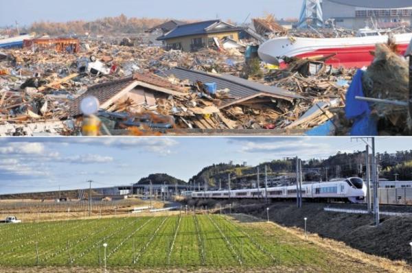 - ▲ 2011年东日本大地震时日本福岛县浪江村的全景(上)。木制住宅仅剩屋顶,其余部分被夷为平地,被海啸冲上来的船只让这里沦为废墟。下图为地震发生15年后,福岛县富冈县重新有火车运行,而且建设了酿酒厂的景象。/福岛县,柳井特派记者
