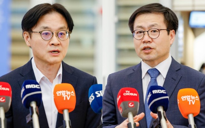 - ▲ 8日,韩国产业部长官金正官、通商交涉本部长吕翰九经仁川国际机场回国,正在回答记者提问。/News1