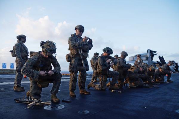 - ▲ 26日,美国海军官网发布的31海兵机动部队所属美海兵队员在USS的黎波里号两栖攻击舰甲板上进行实弹射击训练的画面。/美国海军