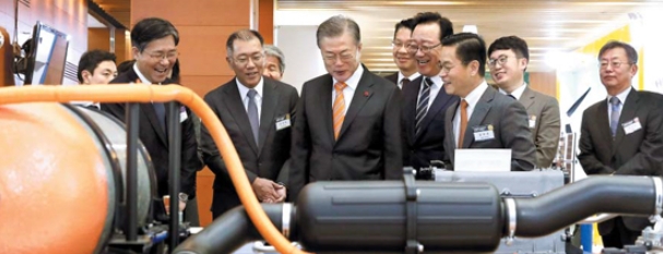 - ▲ 文在寅17日在蔚山南区蔚山市厅举行的政府氢经济路线图发布活动之前,参观氢燃料电池汽车展厅。文在寅说:“政府对氢经济的意志很坚定,我最近是现代汽车,尤其是氢燃料汽车部分的宣传模特。”文在寅左侧是现代汽车首席副会长郑义宣。/NEWSIS
