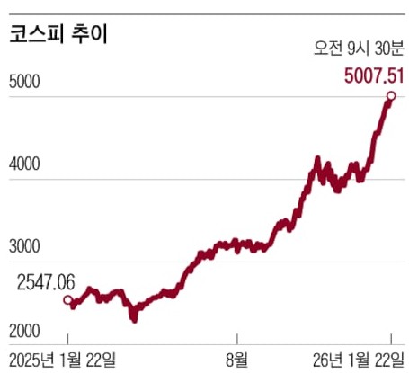 22日,据韩国交易所称,当日KOSPI较前一个交易日上涨1.57%,以4987.06点开盘,随后迅速突破5000点。2025年10月27日KOSPI收盘价首次站上4000点后,时隔约2个半月取得这一成果,达成了1980年编制KOSPI指数46年后的新里程碑。以当天上午9点6分为基准,KOSPI报5011.09点,涨幅达到2.06%。