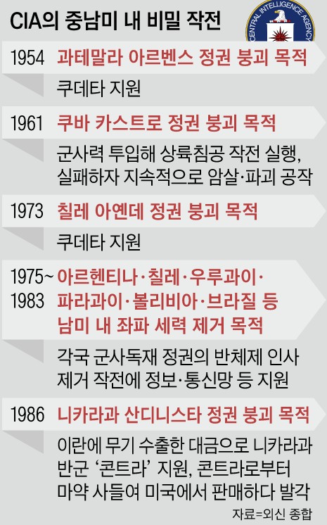 美国在被其视为“后院”的中南美地区开展中央情报局(CIA)的秘密行动由来已久。在过去的冷战时期,为了阻止中南美共产化,美国开展了多样且密集的秘密行动。当时,美国将中南美左派政权视为苏联势力范围,通过情报工作和军事支持,反复实施建立亲美政府的战略。1954年在危地马拉,美国通过所谓的“PB财富”“PB成功”行动,支持流亡军人将领卡洛斯·卡斯蒂略·阿马斯。在中央情报局的支持下,阿马斯发动政变,推翻了哈科沃·阿本斯总统。1973年,中央情报局又在智利支持军事政变,推翻了萨尔瓦多·阿连德政权。