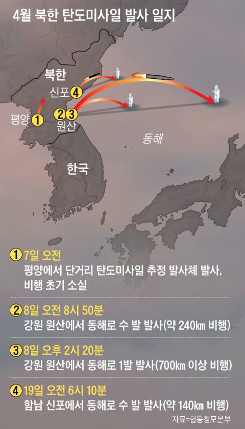 今年一来,朝鲜已进行了七次弹道导弹挑衅。朝鲜在1月4日和27日、3月14日发射了弹道导弹,还在4月7日至8日连续两天分三次发射了弹道导弹。特别是8日,朝鲜在上午和下午分别发射了弹道导弹,其中部分导弹使用了搭载几十至几百枚子弹的集束弹药。