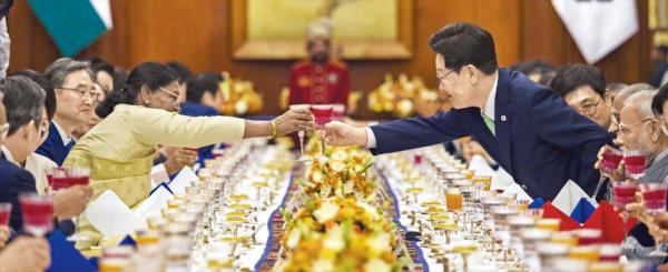 - ▲ 韩国总统李在明与印度总统穆尔穆在共进晚宴时干杯 – 韩国总统李在明当地时间20日在印度新德里总统府举行的韩印国宾晚宴上,与印度总统德劳帕迪·穆尔穆干杯。/纽西斯
