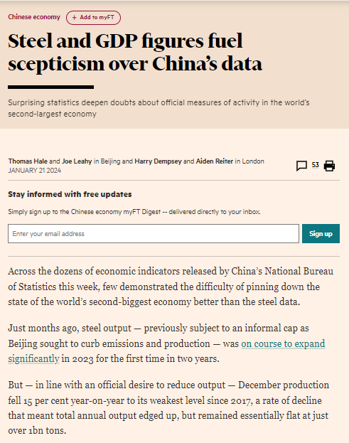 - ▲ 《金融时报》1月21日以参差不齐的钢铁产量统计为依据,提出了去年中国经济增长率统计被捏造的可能性。/FT