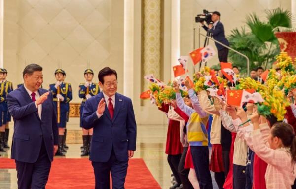 ▲ 5日,在北京人民大会堂举行的韩中首脑会谈“正式欢迎仪式”上,韩国总统李在明与中国国家主席习近平正在问候挥舞两国国旗的儿童。/News1