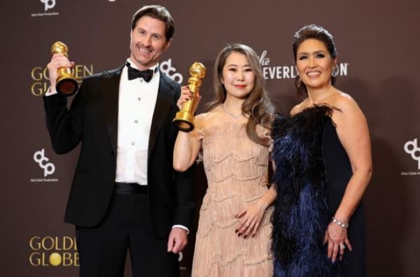 - ▲ 11日,在美国加利福尼亚州比弗利山庄的比弗利希尔顿酒店举行的第83届金球奖颁奖典礼上,(左起)克里斯·艾伯翰斯、玛吉·康、米歇尔·王凭借《K-POP:猎魔女团》(KPop Demon Hunters) 获得最佳动画长片奖(Outstanding Animated Film)后,正举着奖杯留影。/AFP,韩联社