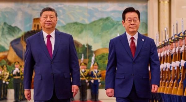 - ▲ 5日,在北京人民大会堂举行的正式欢迎仪式上,韩国总统李在明与中国国家主席习近平正在检阅仪仗队。/News1