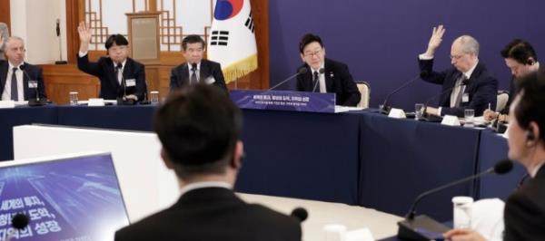 - ▲ 28日,在青瓦台召开的外国人投资企业恳谈会上,与会者正举手向李在明总统申请发言。/韩联社