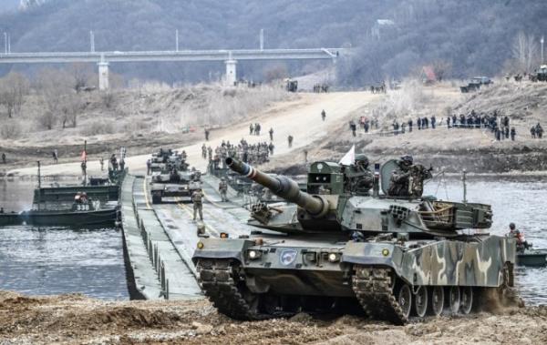 - ▲ 14日,在京畿道涟川郡一带举行的韩美联合多兵种协同演习中,K1A2坦克正在通过韩国军自主渡河装备“水龙”(KM3)和美国改良型战术浮桥(IRB)组成的联合浮桥进行渡河。/韩国陆军