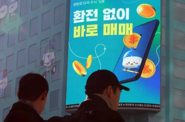 - ▲ 最近首尔某证券公司外墙上的关于美国股票投资的广告。/韩联社
