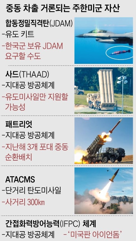 如果要与伊朗打持久战,美军将驻韩美军的8个爱国者导弹发射架等国内防空资产转移到中东的可能性首先被提了出来。专家们表示,部署在庆北星州的萨德(THAAD)可能会留下雷达和发射架,仅运走几十枚拦截导弹。有人担忧,如果爱国者和萨德的战斗力被运走,韩国的防空网将被削弱,可能会引发韩国防御态势的问题。