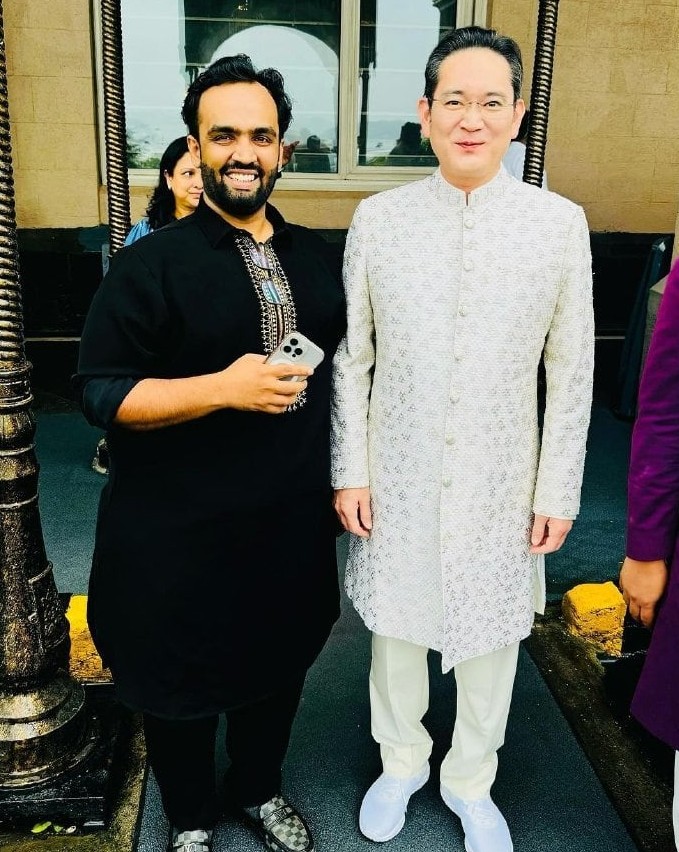 - ▲ 2024年,三星电子会长李在镕出席亚洲顶级富豪印度信实工业集团董事长穆克什·安巴尼小儿子的婚礼,正与一位宾客合影留念。(微博)/News1