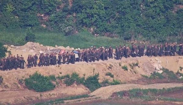 - ▲ 2024年6月,大批朝鲜军投入前线地区作业的场景。当时,据韩国联合参谋本部称,朝军在非武装地带(DMZ)贸然作业导致多人因地雷爆炸出现伤亡。/联合参谋本部