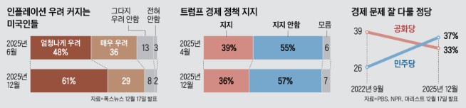 当下消费力锐减的消费者开始对特朗普政府心生不满。根据近期的舆论调查,特朗普虽在强硬边境封锁政策、执法零容忍等方面获得较为积极的评价,但在经济政策上支持率止步于30%左右,相当于被判定不及格。17日,保守倾向的福克斯新闻公布民调结果显示,72%的应答者认为当前经济状况“差”,占比较5个月前上升了5%p。在同一项调查中,61%的应答者表示“十分担忧”通胀,占比较6月(48%)上升了13%p。21日,美国CBS发布的民调结果显示,针对“给当前美国经济打几分(A、B、C、D、F)”的提问,75%的应答者评价为C级及以下。