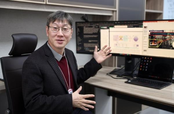 - ▲ 29日,离子阱量子科学研究团长金奇奂正在大田基础科学研究院本院向记者介绍离子阱量子计算机。金奇奂前一天辞去了清华大学物理学教授一职,回到了韩国。/张润记者