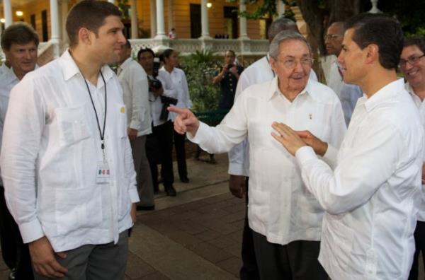 - ▲ 2015年古巴对墨西哥进行国事访问时,与祖父劳尔·卡斯特罗(中)及墨西哥总统恩里克·培尼亚·涅托在一起的劳尔·吉列尔莫·罗德里格斯·卡斯特罗(最左)。/维基百科