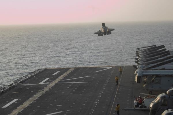 - ▲ 10日,美国海军陆战队所属F-35B闪电Ⅱ正从美军登陆舰USS的黎波里(LHA-7)上起飞。该舰正在美军中央司令部辖区航行。/美国中央司令部