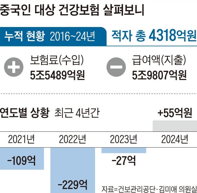 2016年至去年,中国公民缴纳的健康保险费总额为5万5489亿韩元(人民币约279亿元),而中国公民从健康保险工团获得的金额(补贴额)比这个数字多出4318亿韩元(人民币约22亿元),达到5万9807亿韩元(人民币约300亿元)。按年度来看,除了去年和2020年以外,其余年份均为赤字。在各年度的赤字中,2018年的赤字最高,为1509亿韩元(人民币约7亿6000万元)。2020年实现了365亿韩元(人民币约1亿8000万元)的盈余,推测是因为当时受新冠疫情的影响,中国公民在韩国使用的医疗服务减少。此外,从去年4月开始,为了防止“中国公民医疗购买”,将外国人享受健康保险福利的条件强化为必须在韩国至少停留6个月(原为3个月)。去年中国人健康保险收支小幅转为盈余,主要得益于上述措施。