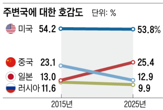 过去10年间,针对环伺美国、中国、日本、俄罗斯4强国家,仅日本的好感度有所上升。“对日本友好”的应答率为25.4%,对比10年前(13%)接近翻倍。对美国的好感度从2015年的54.2%略降至53.8%;对俄罗斯的好感度从11.6%略降至9.9%。
