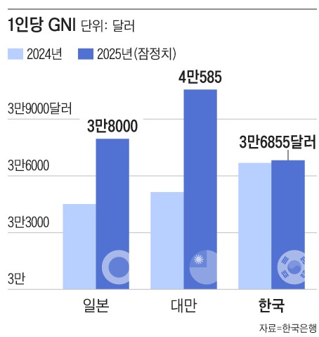 2023年和2024年,韩国人均GNI连续2年领先日本、台湾,但2025年被日台双双反超。据韩银称,以截至目前公布的暂定值为基准,日本2025年人均GNI约为3万8000美元,台湾为4万585美元,均超过韩国。2024年,在联合国统计的人口超5000万国家的人均GNI排名中,韩国位列第6名,但2025年日本与台湾数值均高于韩国,排名大概率会跌至第8名以下。