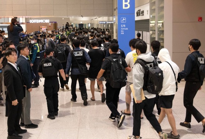 - ▲ 柬埔寨政府打击犯罪园区时抓获的韩国人正经仁川国际机场第2航站楼被遣返回国。/News1