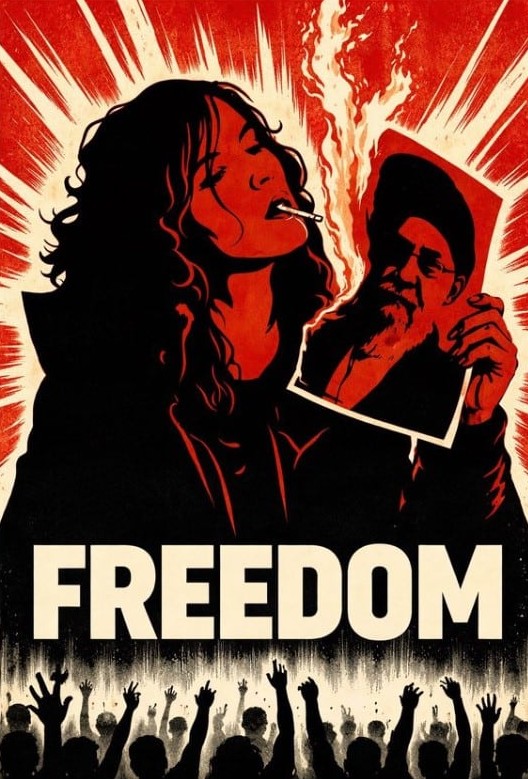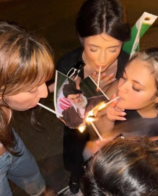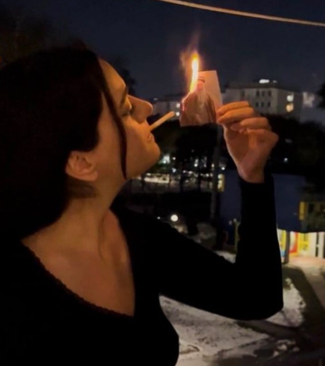 - ▲ 焚烧伊朗最高领袖阿亚图拉·阿里·哈梅内伊的照片后,用它点燃香烟的女性。/X