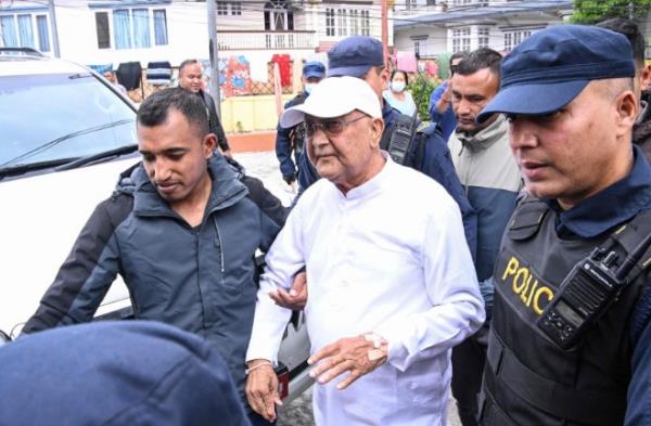 - ▲ 28日,被警方逮捕的前尼泊尔总理夏尔马·奥利(中)被送往医院。/法新社