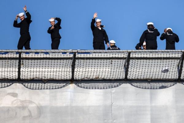 - ▲ 当地时间3月31日,乔治H.W.布什号出港前,船员们正在挥手致意。/AP,韩联社