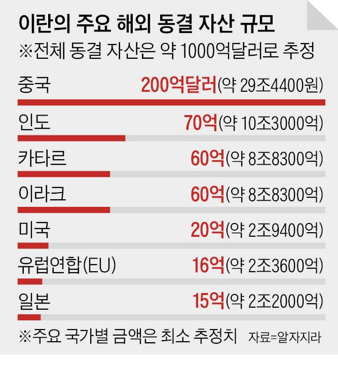 韩国也冻结了伊朗60亿美元的资金。这些本应用于向伊朗支付石油和天然气进口款项的资金,分散存放在韩国银行和IBK企业银行,却在2018年美国唐纳德·特朗普第一任期政府开始对伊朗实施制裁后被冻结。但作为释放被伊朗扣押的美国人的条件,这60亿美元于2023年9月被转移到了卡塔尔商业银行的伊朗中央银行账户。
