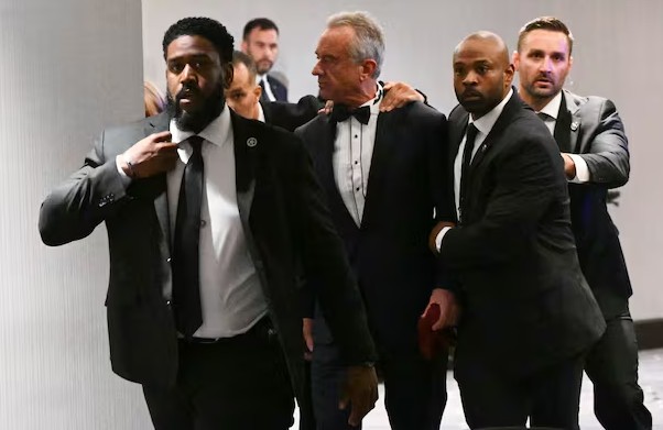 - ▲ 当地时间25日,在华盛顿特区的华盛顿希尔顿酒店举行的白宫记者团年度晚宴途中,突然响起枪声,美国卫生与公众服务部部长小罗伯特·F·肯尼迪正在特勤人员保护下紧急撤离。/AFP,韩联社