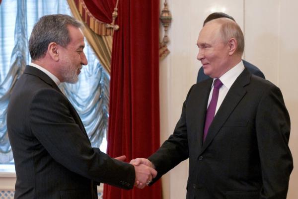 - ▲ 当地时间27日,访问俄罗斯莫斯科的伊朗外交部长阿巴斯·阿拉格齐(左)会见俄罗斯总统弗拉基米尔·普京时,正在与其握手。/塔斯社