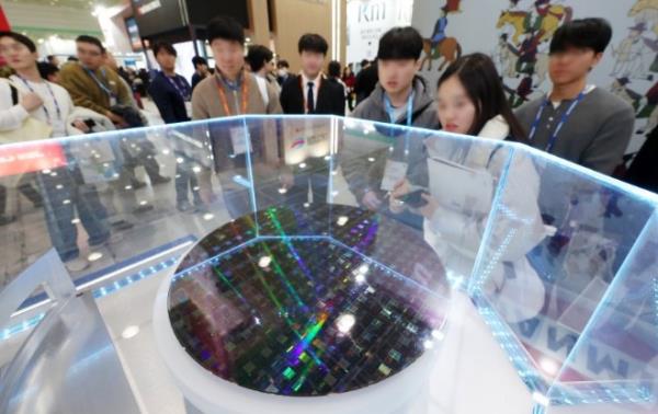 - ▲ 11日下午,在首尔江南区COEX举行的SEMICON Korea 2026上,到访者正在参观芯片晶圆。/纽西斯