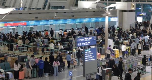 ▲ 13日上午,在春节连休前,仁川国际机场第1航站楼出境大厅旅客熙熙攘攘的景象。/News1