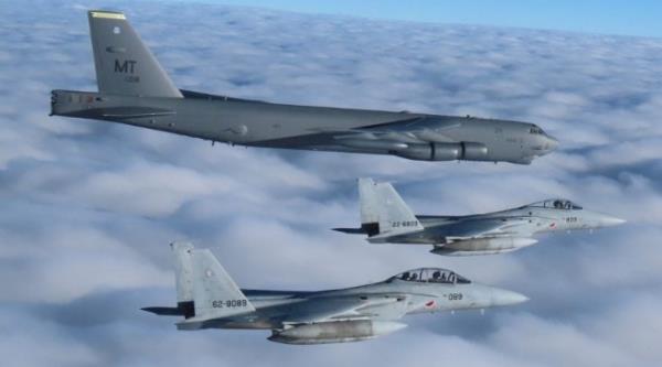 - ▲ 2024年12月在西太平洋,美国空军B-52H战略轰炸机在日本自卫队下属的F-15战斗机的护航下进行联合训练。上周在韩半岛周边第一岛链以内,美国本土战略资产与日本自卫队、驻韩美军战斗机同时出动的行动是罕见的,被评价为针对中国的行为。/日本自卫队