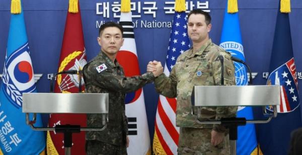 - ▲ 联合参谋本部宣传室长张道永(音)(左)与驻韩美军司令部宣传室长瑞安·唐纳德25日在首尔龙山区国防部发表2026年“自由盾”(FS)演习计划后正在握手。/摄影共同采访团