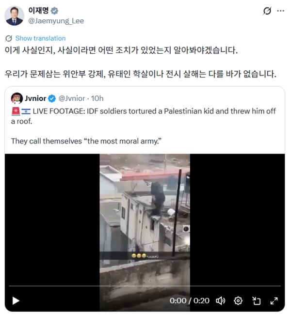 以色列过度的军事行动与由此造成的平民伤亡正遭到国际社会的批判。李在明总统如果意在强调“普遍人权”,理应考虑一下发文的内容与时机。针对一个正在经历战争的国家,通过社交媒体,引用不实内容,甚至提及大屠杀,实在有失妥当。