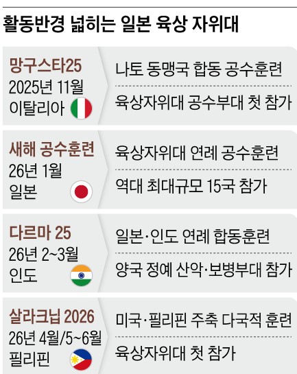 2025年10月保守派首相高市早苗上任后,陆自的全球活动持续扩大。2025年11月,日本首次派遣自卫队空降部队参加了在意大利举行的北约(NATO,北大西洋公约组织)的联合空降演习“Mangusta 25”。当时,该部队指挥官与队员还上演了一同背着降落伞跳下飞机的画面。