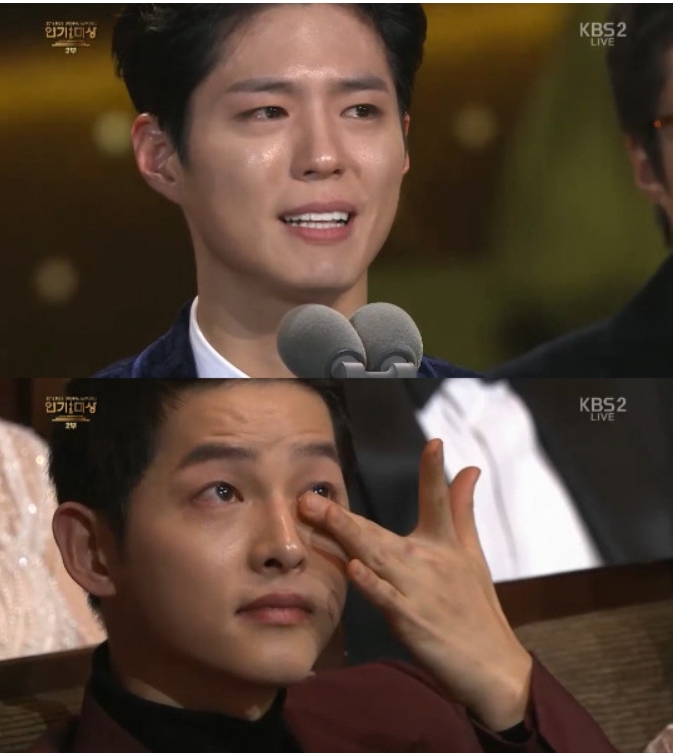 宋仲基当天讲述了,朴宝剑在颁奖典礼上获得最优秀演技奖时自己流泪的原因。他表示:“事后没少受朋友戏弄”,“我想起了宝剑在饰演第一部主演的电视剧时苦恼的样子。4年前我获得最优秀演技奖时非常紧张,所以就想宝剑是不是也很紧张。”朴宝剑则表示宋仲基让自己备受感动,“那将是难以忘怀的12月31日”。