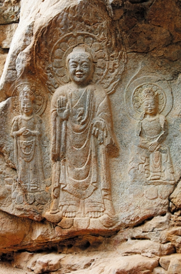 - ▲ 百济的微笑 - 瑞山游客不容错过的百济摩崖如来三尊像。被指定为国宝第84号的摩崖如来三尊像,雕刻在伽倻山溪谷一侧的悬崖上。中间的佛像表情慈悲,因“百济的微笑”而闻名。