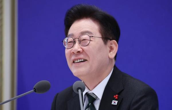 - ▲ 21日,在青瓦台迎宾馆举行的新年记者会上,韩国总统李在明正在发言。/韩联社