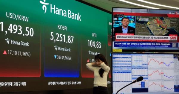 - ▲ 9日下午,首尔中区韩亚银行交易大厅电子屏正显示着KOSPI指数与美元·韩元汇率,以及西德克萨斯中间基原油(WTI)期货价格。当天KOSPI较前一个交易日下跌333.00p(5.96%),报5251.87;KOSDAQ下跌52.39p(4.54%),报1102.28;首尔外汇市场美元·韩元汇率较前一个交易日下午3点30分的周收盘价上涨7.90韩元,为1492.90韩元(约合人民币6.98元)。/News1