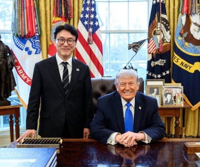 - ▲ 金民锡与特朗普突然会晤…朝鲜发射600毫米火箭炮。当地时间13日,韩国国务总理金民锡在美国华盛顿白宫与美国总统唐纳德·特朗普会面并合影(上图)。据金民锡称,特朗普询问朝鲜国务委员长金正恩是否有兴趣与自己对话。但14日,朝鲜动用12门600毫米火箭炮进行了武力示威。/韩国总理室,劳动新闻,News1